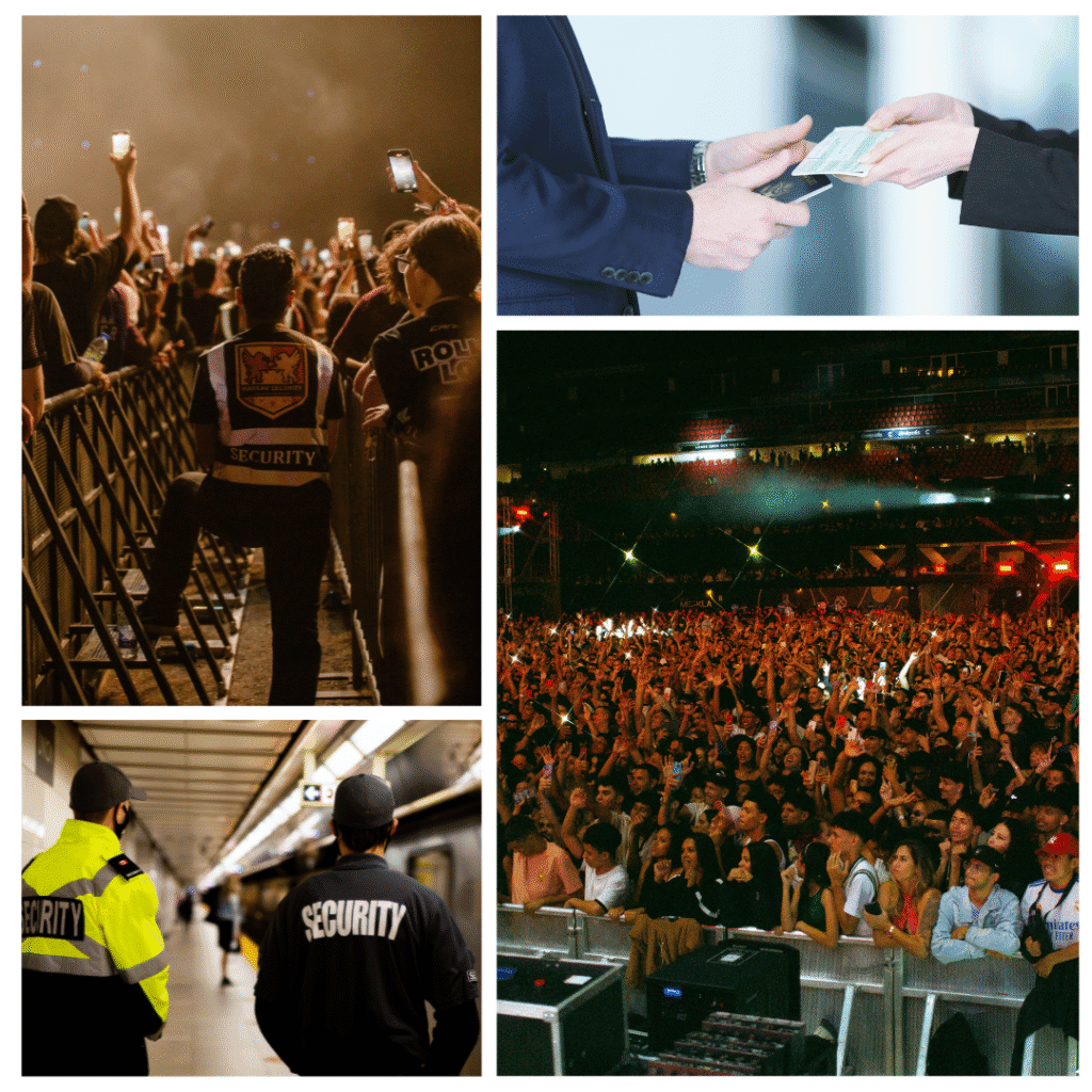 We manage Entrances & exits, Bag checks, Crowd flow, Backstage & restricted zones, VIP protection, Emergency procedures